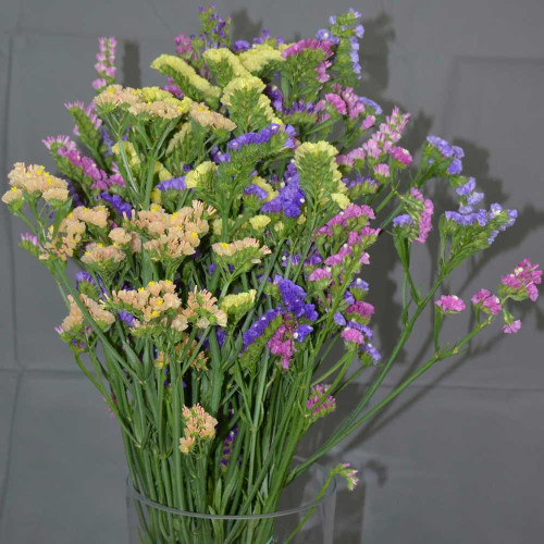 El limonium sinuatum, conegut també com “statice”, és una flor de textura seca i aspecte eteri. S’utilitza sovint com a flor de farciment per donar volum i contrast en rams i centres. Els seus petits flors poden ser de color lila, blau, blanc, rosa o groc, i duren molt de temps. És ideal tant per a arranjaments frescos com per a composicions seques.
